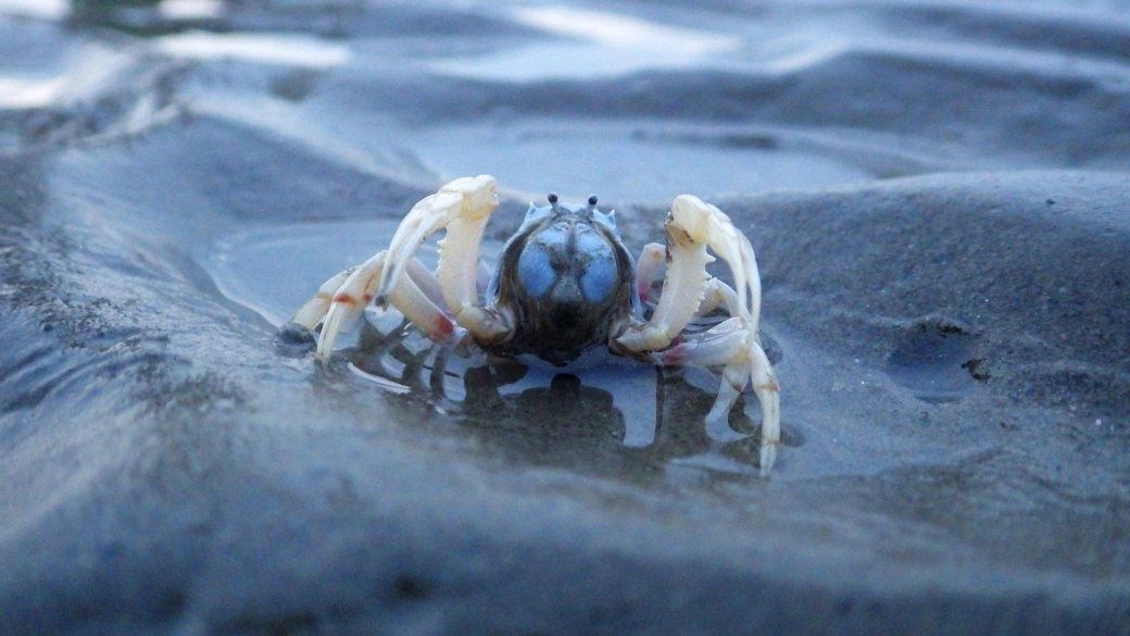 體色:成蟹頭胸部成淡藍色,螯腳及步足淡黃,步足長節基部為珠紅色。幼蟹土黃色。