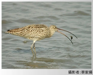 型態特徵:又名紅腰杓鷸,在杓鷸屬中是屬於體型較大的種類,杓鷸的特色就是長而下彎的嘴,體長約60公分,腹面乳黃色,下背部及尾部為褐色,體色較白腰杓鷸深。
