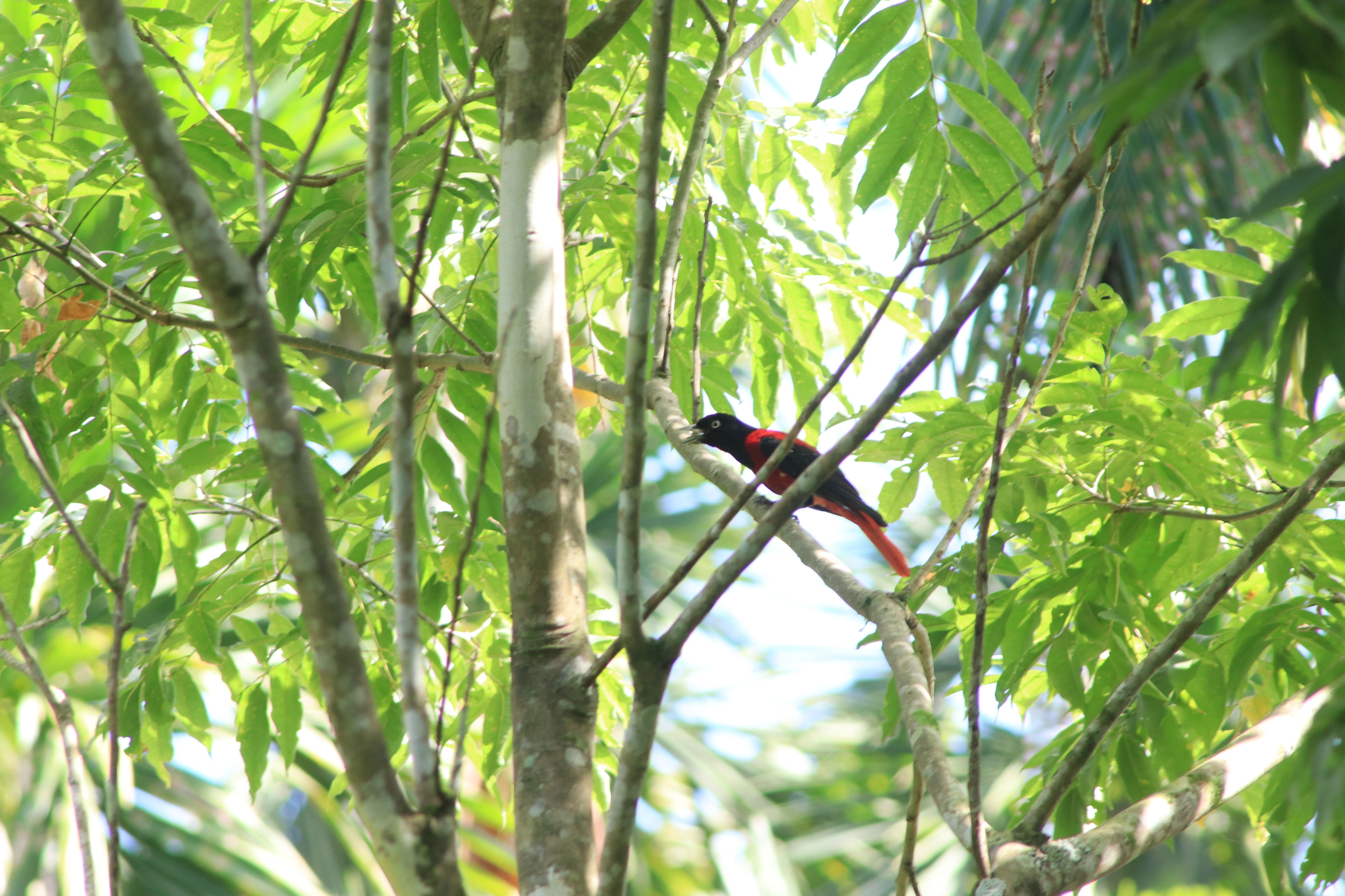 描述:體長約25cm,雌雄鳥的羽色略有不同。雄鳥喙鉛色,虹膜白色,頭、頸、上胸及翼為黑色,其餘部分皆為鮮朱紅色,腳鉛色。雌鳥的羽色類似雄鳥,但胸及腹雜有白色羽毛及黑色縱斑。亞成鳥的頭、頸、上胸及翼為暗褐色,背、尾羽及尾下覆羽暗紅色,胸至腹部污白色,雜有暗褐色縱斑。
