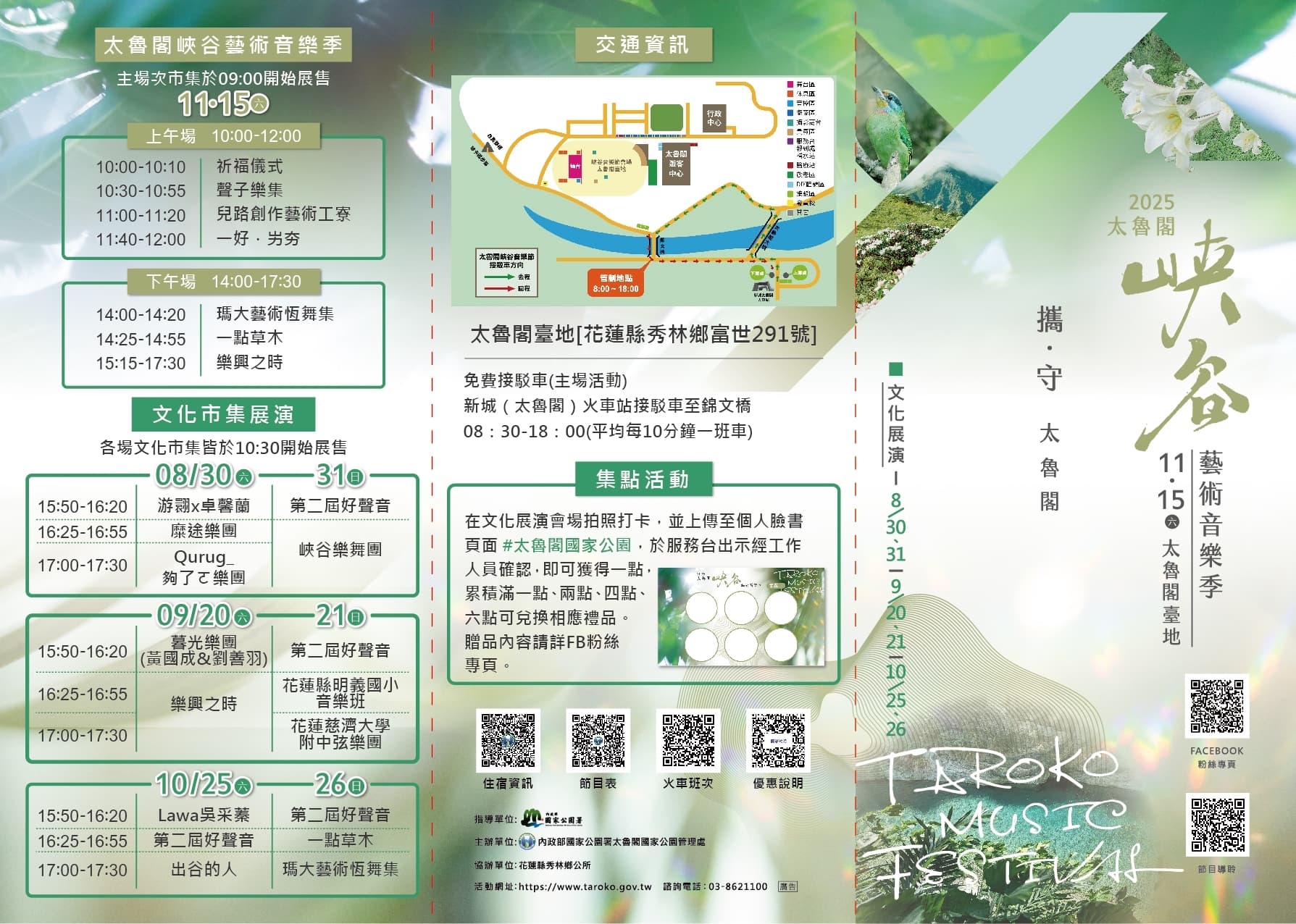 「2025太魯閣峽谷藝術音樂季」將於11月15日(星期六)在太魯閣臺地登場,太魯閣國家公園管理處(以下簡稱太管處)提供接駁專車,免費接送參加峽谷音樂節的民眾往返新城車站與太魯閣臺地之間,方便大家到太魯閣臺地欣賞精彩的演出。