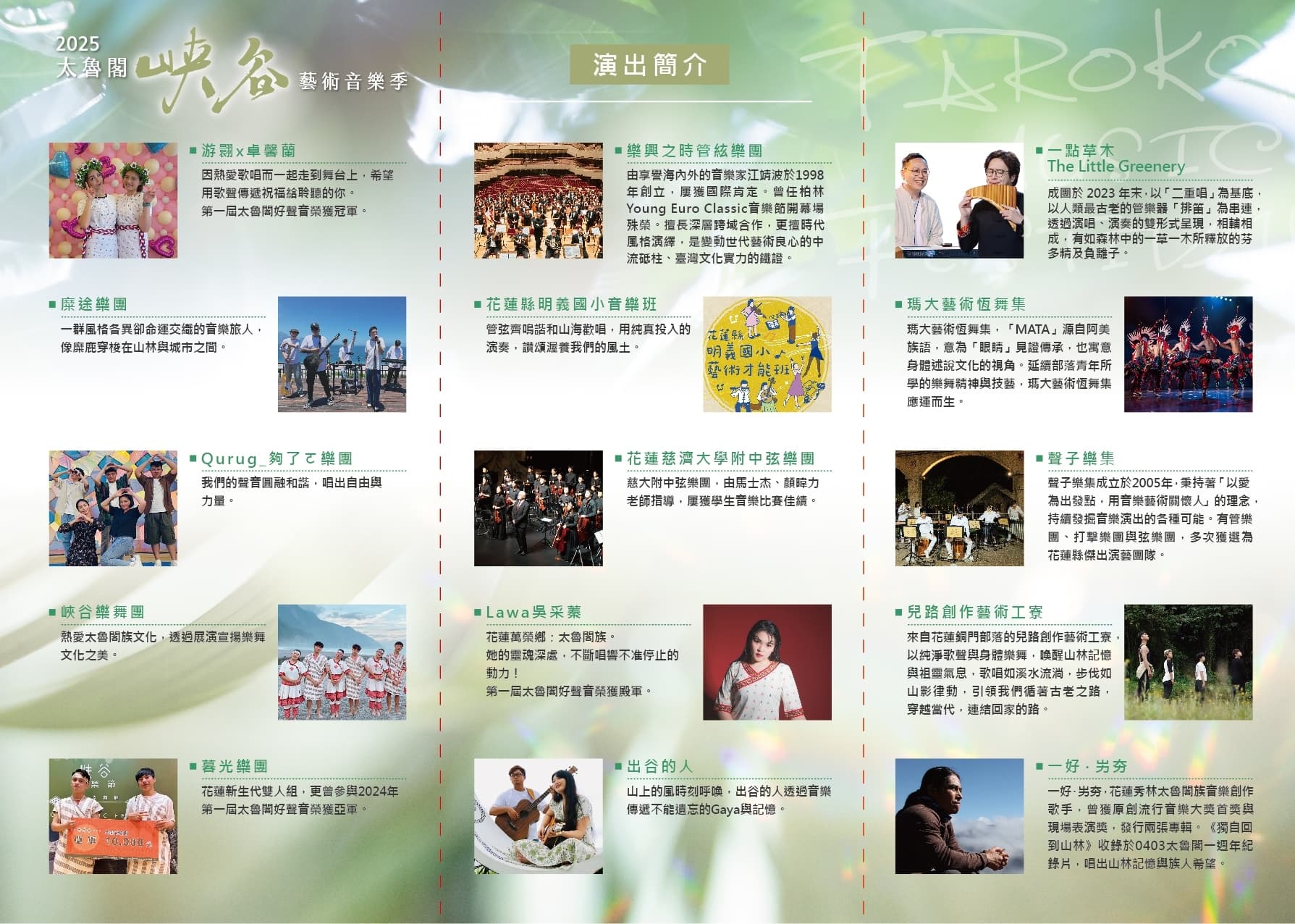 太管處表示,今年的太魯閣峽谷藝術音樂季有上、下午2場,上午10時起聲子樂集、太魯閣族的兒路創作藝術工寮、一好‧屴夯將率先登場。下午場從2時開始,先由瑪大藝術恆舞集開場,緊接著一點草木的排笛演奏,而樂興之時管絃樂團則是重頭戲,將有滿滿2小時的演出,而今年太魯閣好聲音甄選第一名的蔡佳欣(Kirby)將與樂興之時管絃樂團合作。