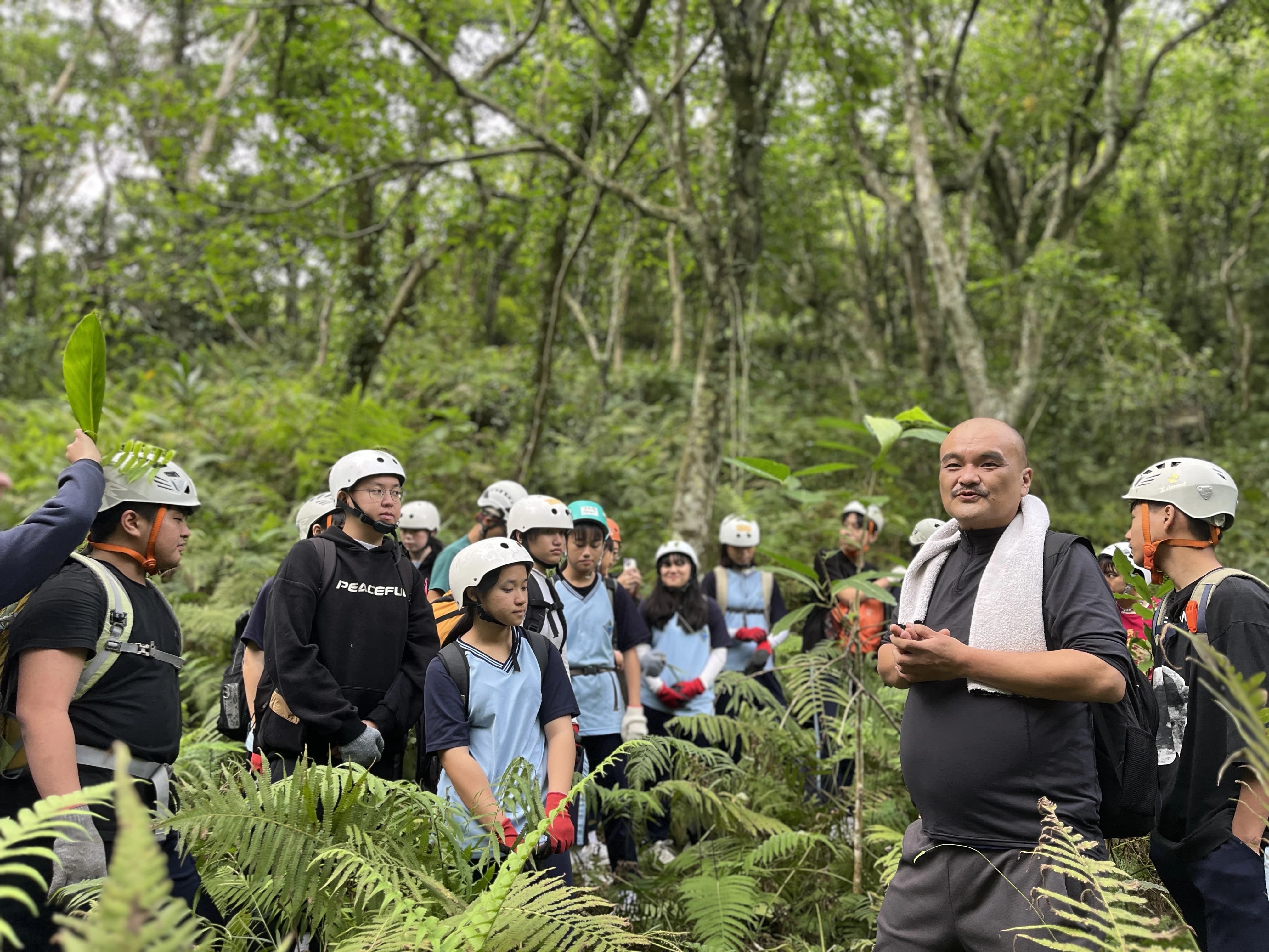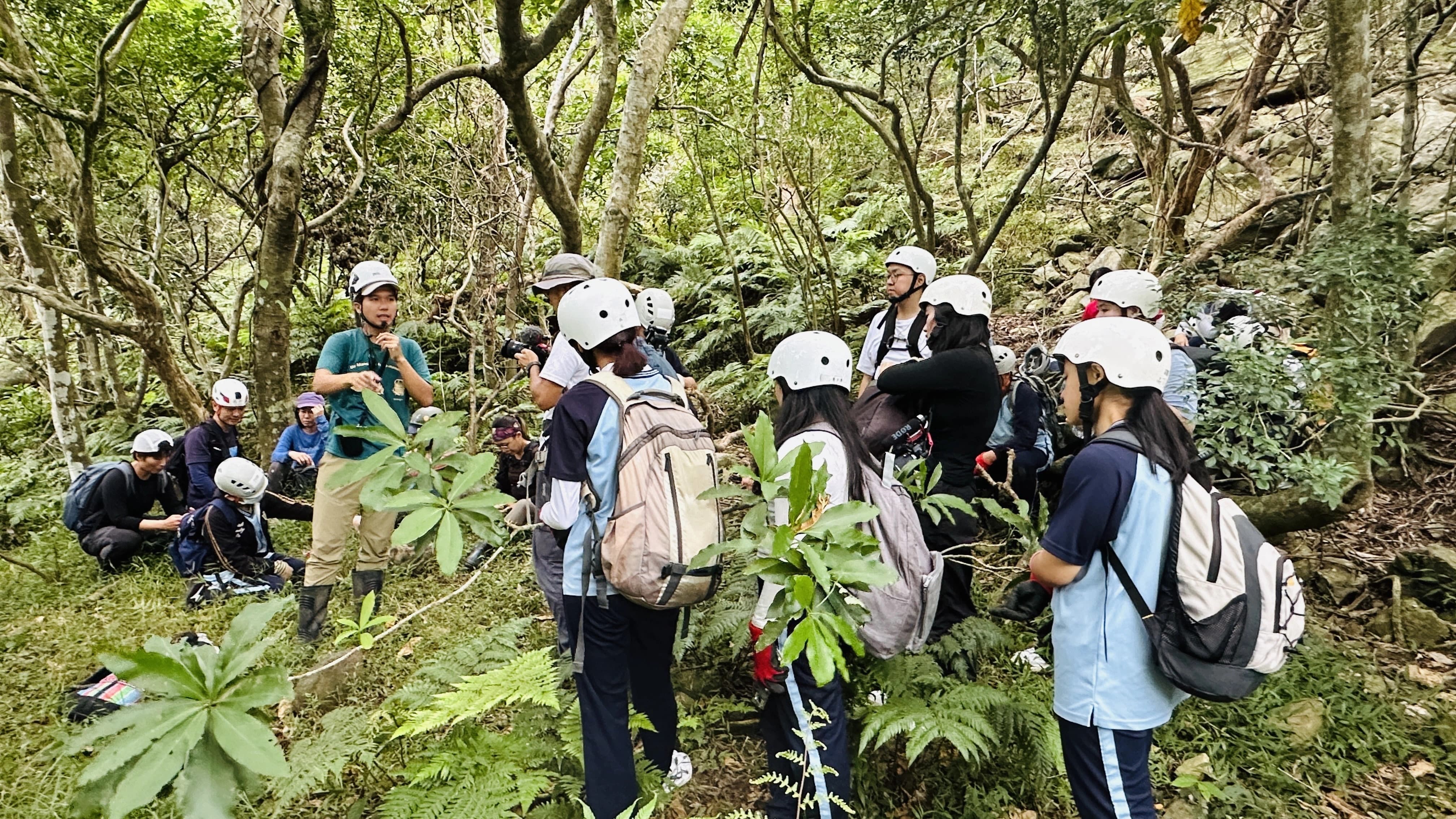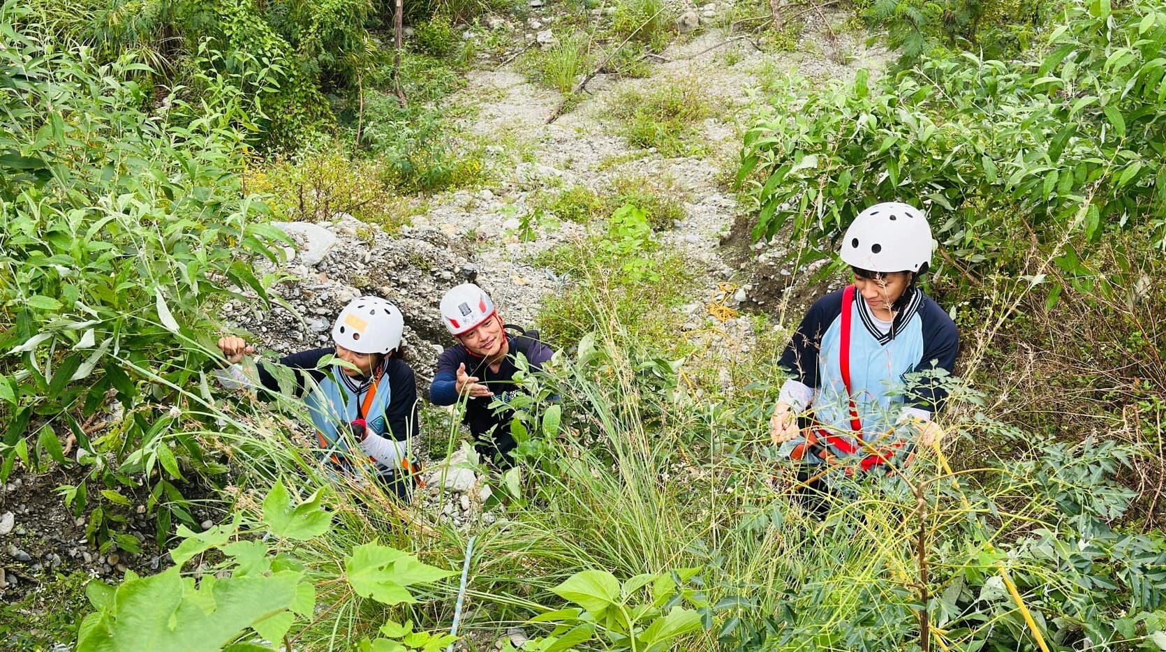 從平臺上再向上攀爬,終於回到昔日的部落。講師與教練帶著同學在蔓草叢林中尋找砌石駁坎等部落遺構,也安排自由的時間,讓所有人在部落中探索、觀察與思考。下午從部落下山回到公路,同學還垂降到福德祠下方邊坡,探查先前播撒種子的植物生長的狀況。