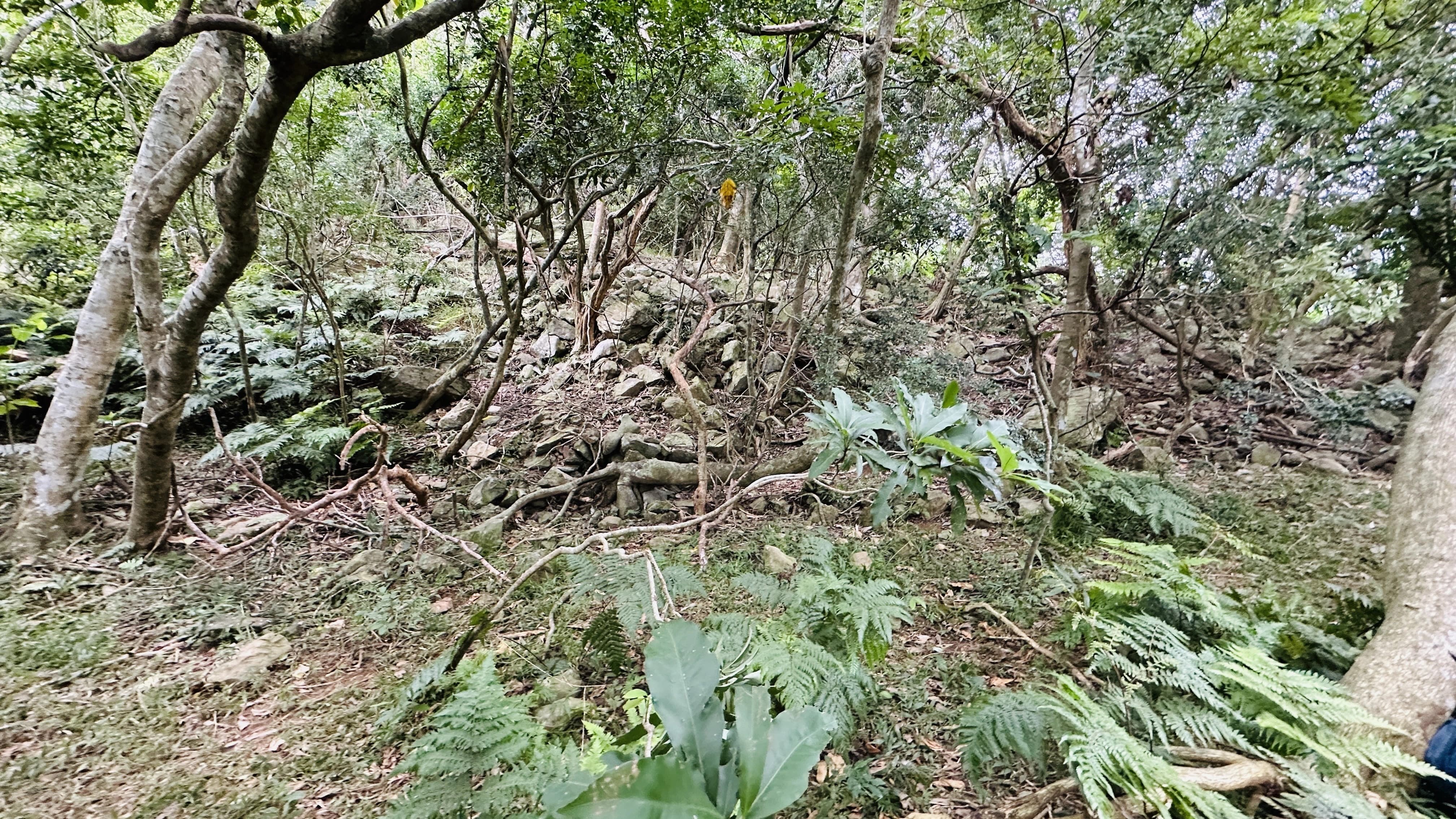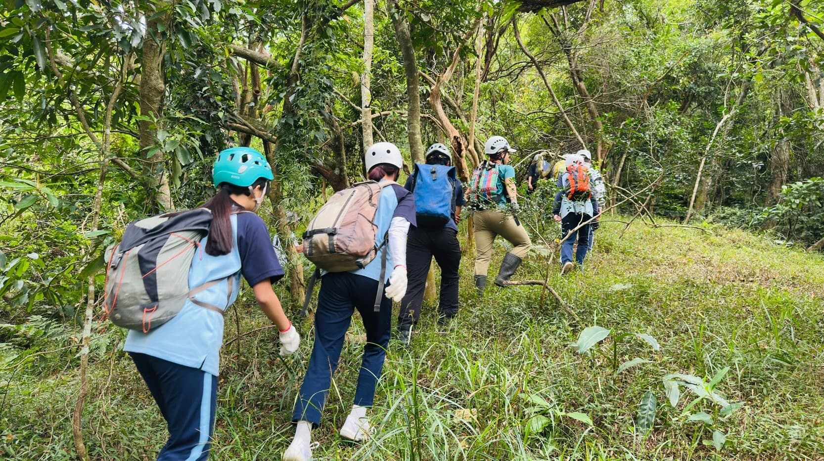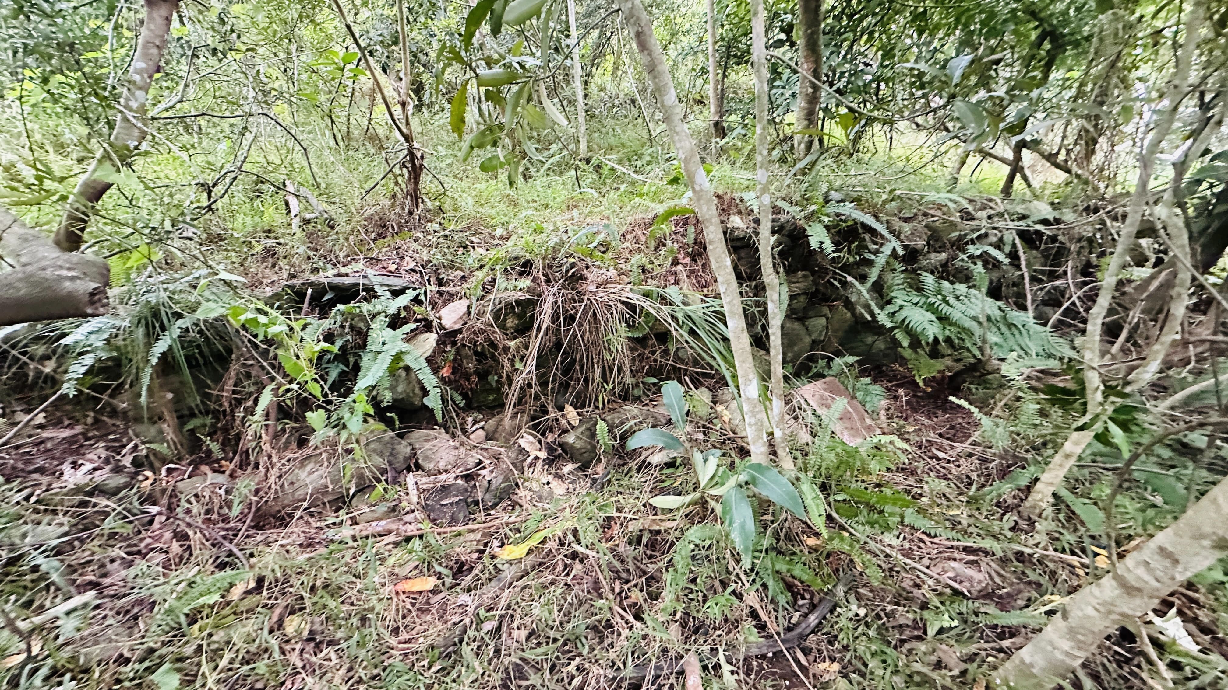 從平臺上再向上攀爬,終於回到昔日的部落。講師與教練帶著同學在蔓草叢林中尋找砌石駁坎等部落遺構,也安排自由的時間,讓所有人在部落中探索、觀察與思考。下午從部落下山回到公路,同學還垂降到福德祠下方邊坡,探查先前播撒種子的植物生長的狀況。