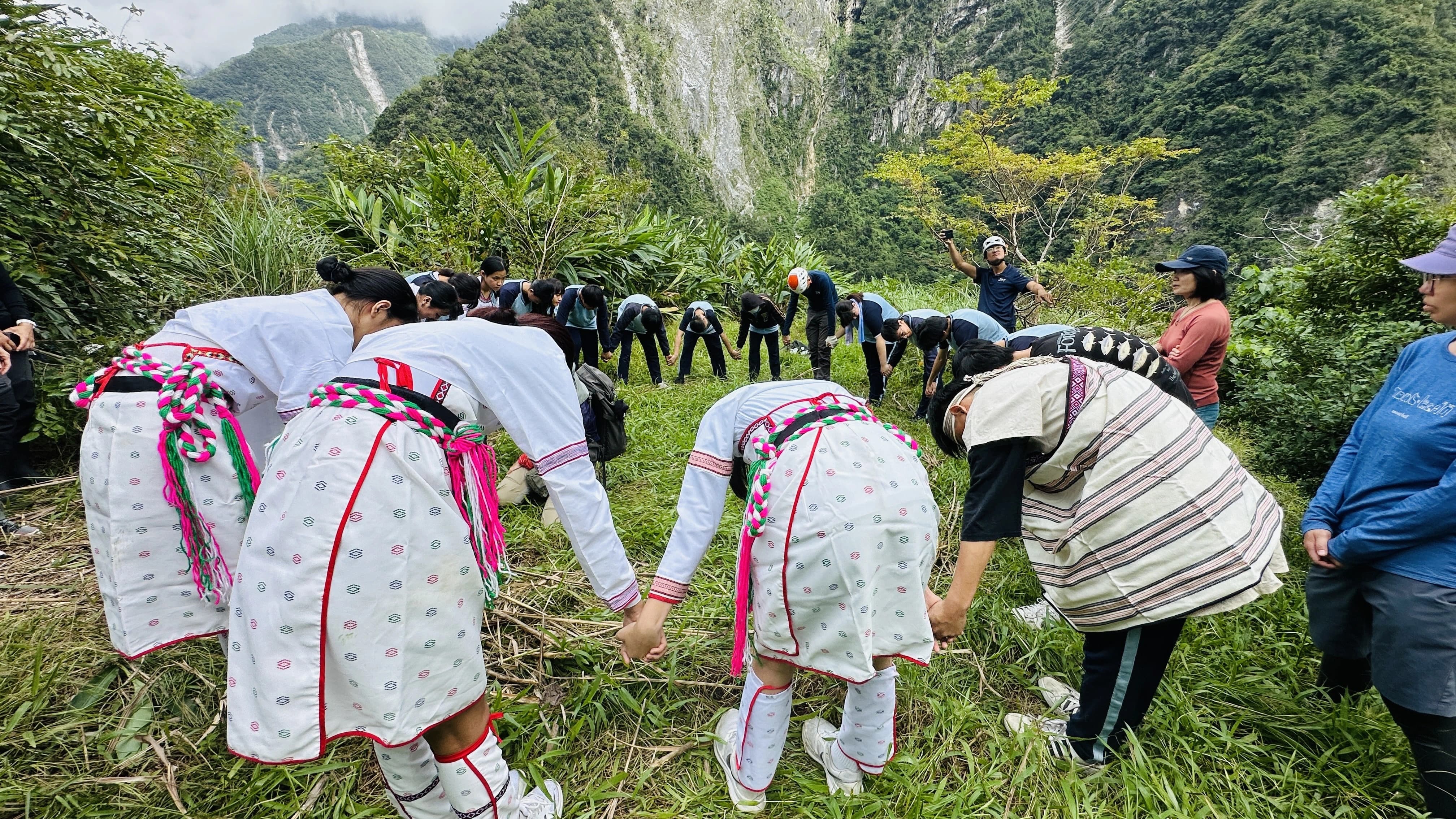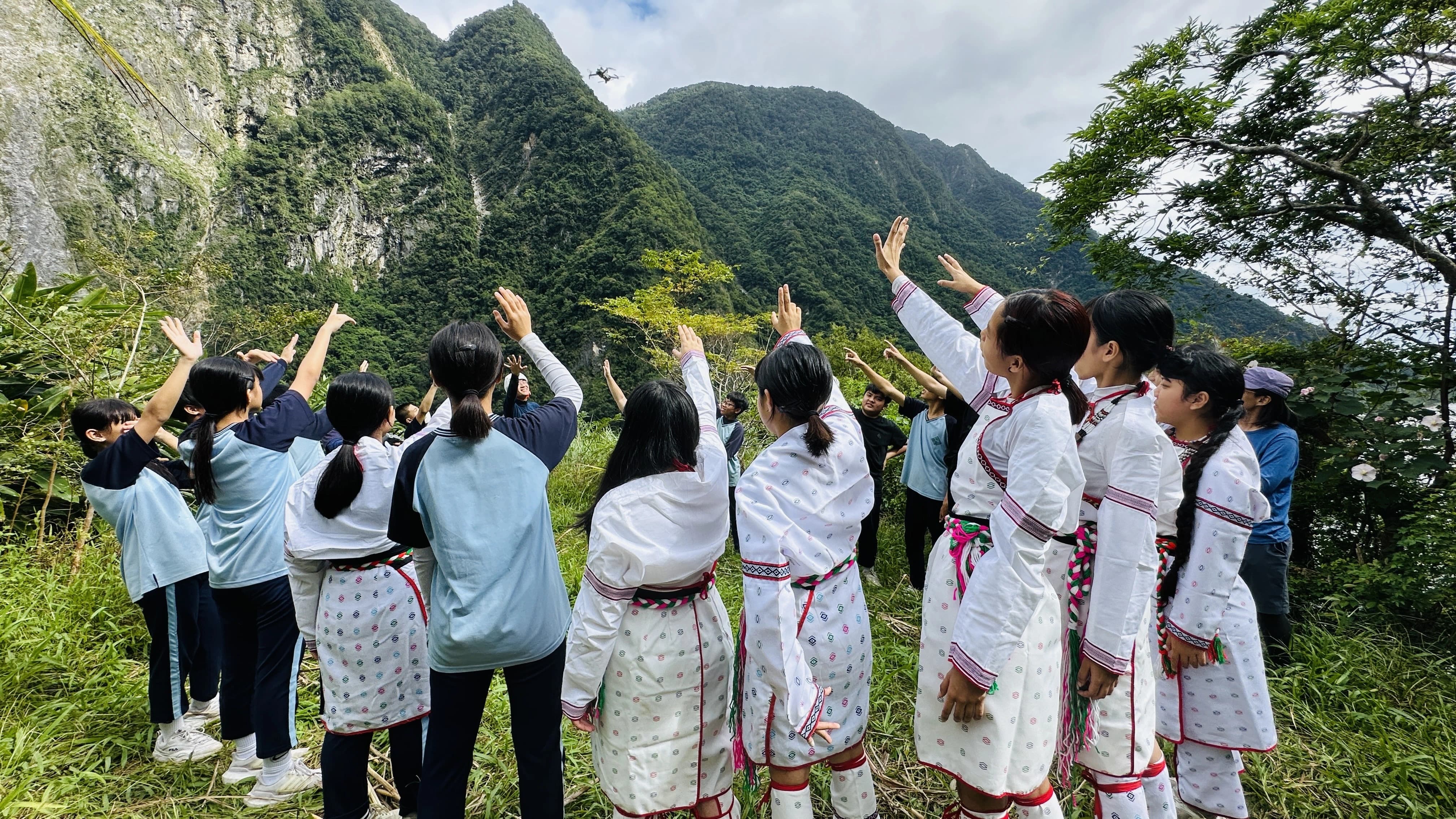 當一行人爬升到高處平臺,從高處往下俯瞰,從近到遠的景色開展,立霧溪下游出海口、河階地、沖積扇及週邊的山稜盡收眼底。同學第一次從這個角度看到立霧溪出海的景色,都感到興奮好奇。在山水美景中,老師則帶領同學們換上太魯閣族傳統族服,在平臺上圍成一圈,以傳統的舞步向祖先傳達年輕人返回部落尋根的心意。