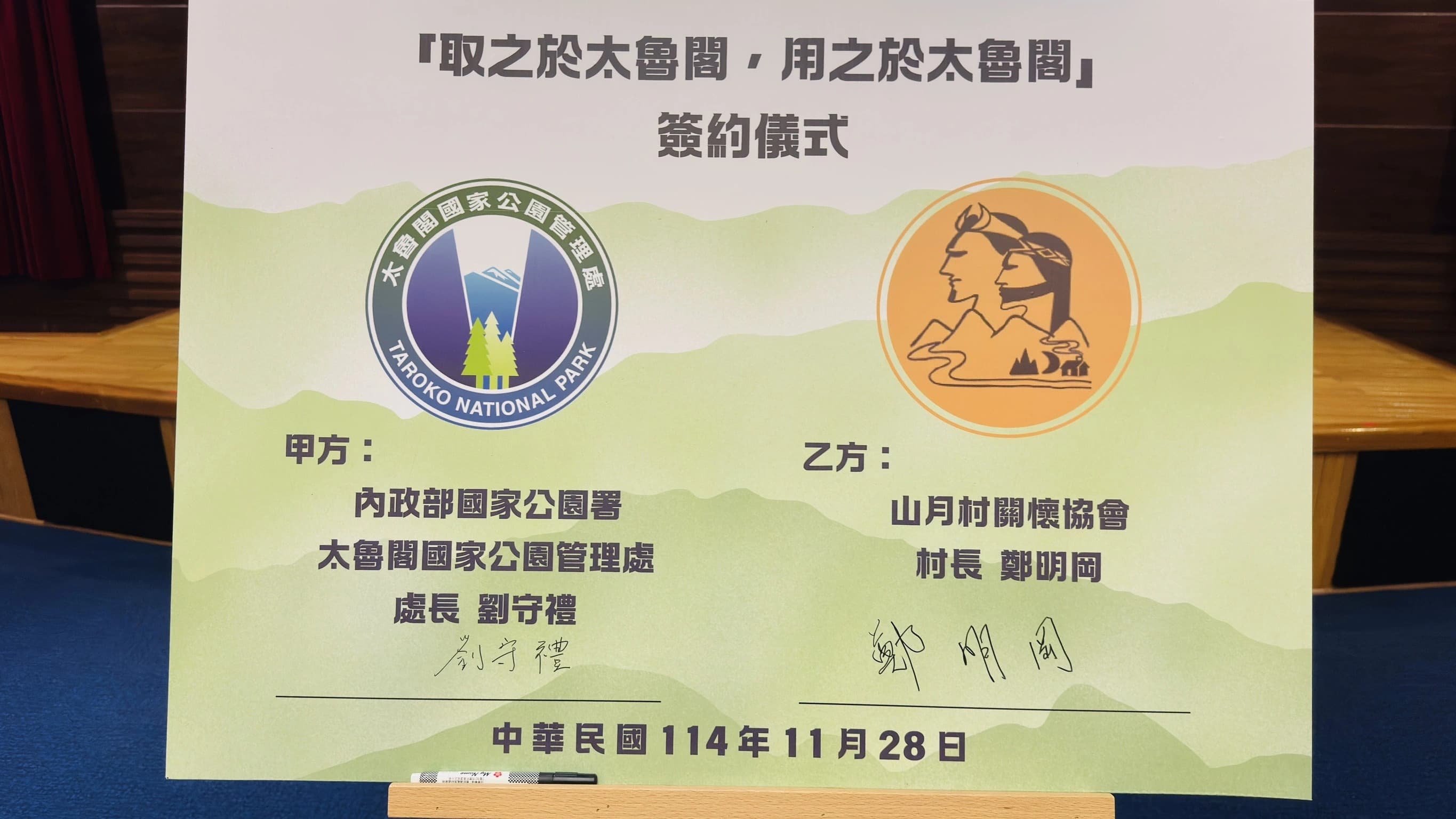 社團法人山月村關懷協會與太魯閣國家公園管理處(下稱太管處)簽訂契約,贊助太管處經費投入太魯閣原民文化推廣及園區復健使用。