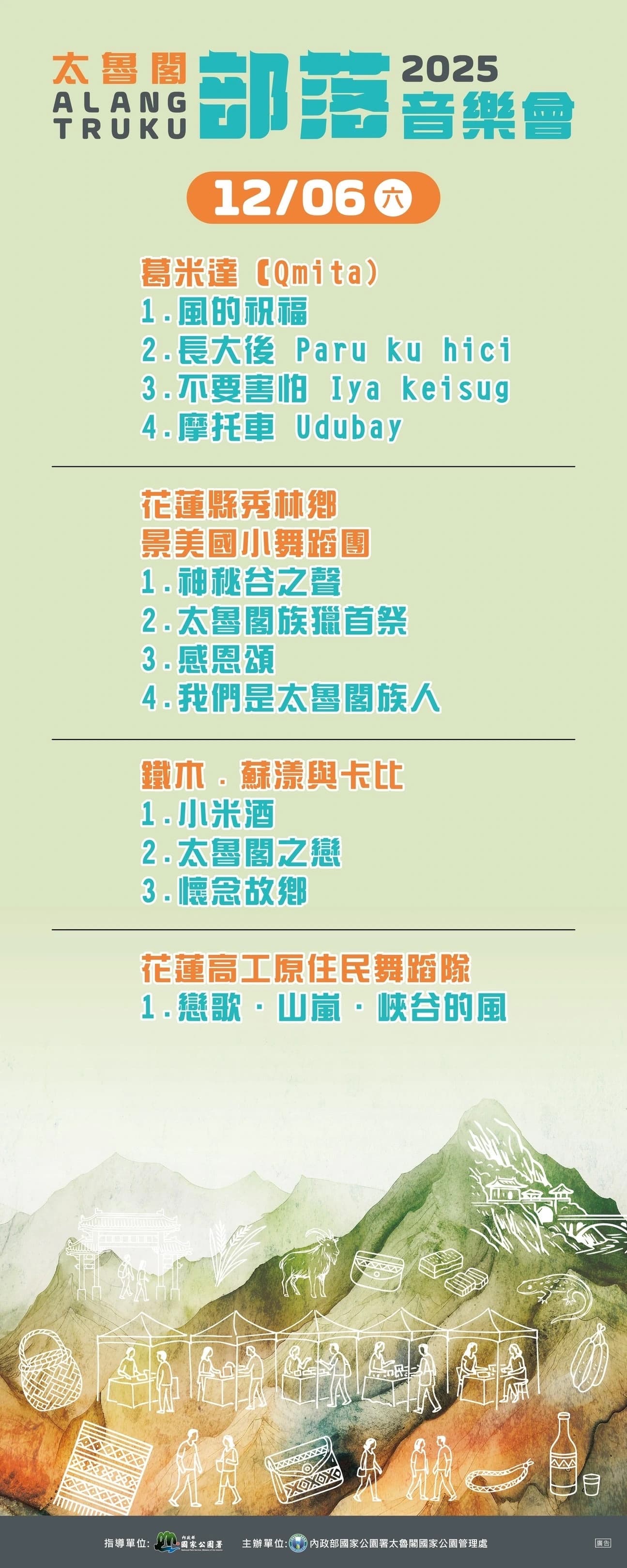 太魯閣國家公園管理處(以下簡稱太管處)表示,今年的部落音樂會活動共舉辦3場,12月6日是最後一場,主要邀請在地的音樂舞蹈團體演出,也安排社區工坊和小農設攤,可以透過傳統樂舞演出及工藝展示認識太魯閣族文化。