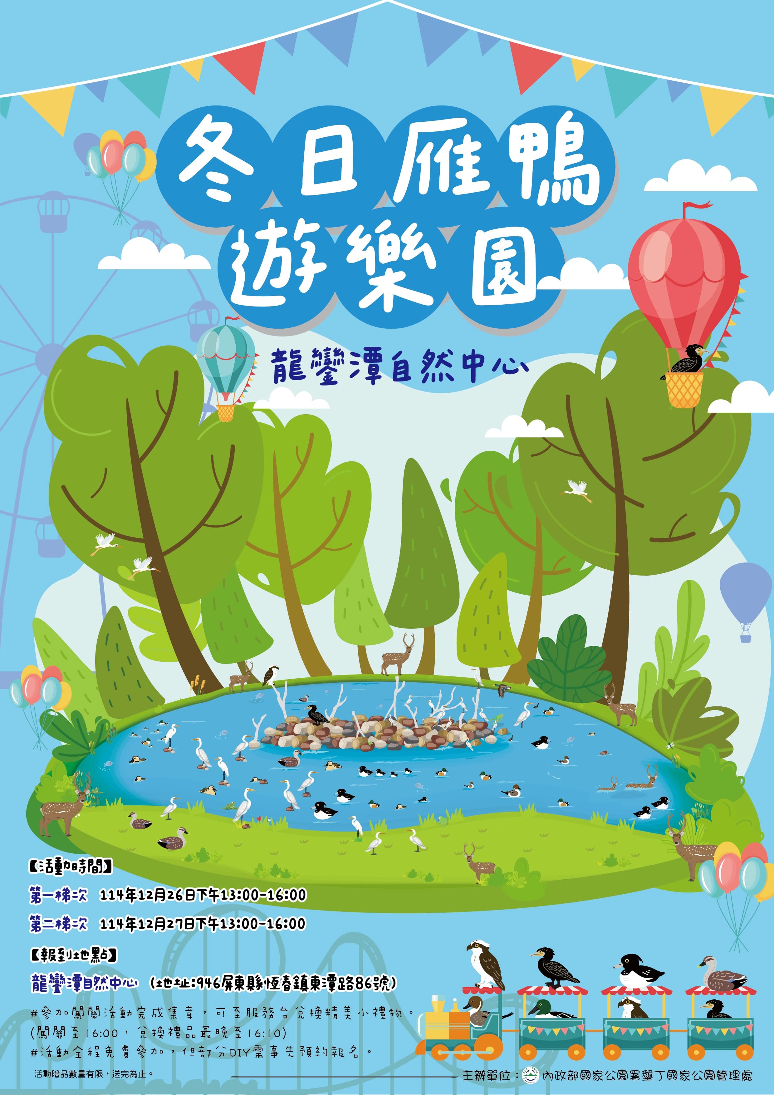 龍鑾潭濕地為南臺灣重要之冬候鳥棲息環境,每年冬季均吸引北方雁鴨族群南下度冬。為深化民眾對濕地生態之認識,並推廣候鳥保育觀念,墾丁國家公園管理處(下稱墾管處)將於114年12月26日至27日在龍鑾潭自然中心舉辦「冬日雁鴨遊樂園」系列活動。活動內容含蓋環境教育闖關、知性演講、室內賞鳥及DIY創作等,兼具教育性與趣味性。有意參加的民眾可上墾管處網站報名。
