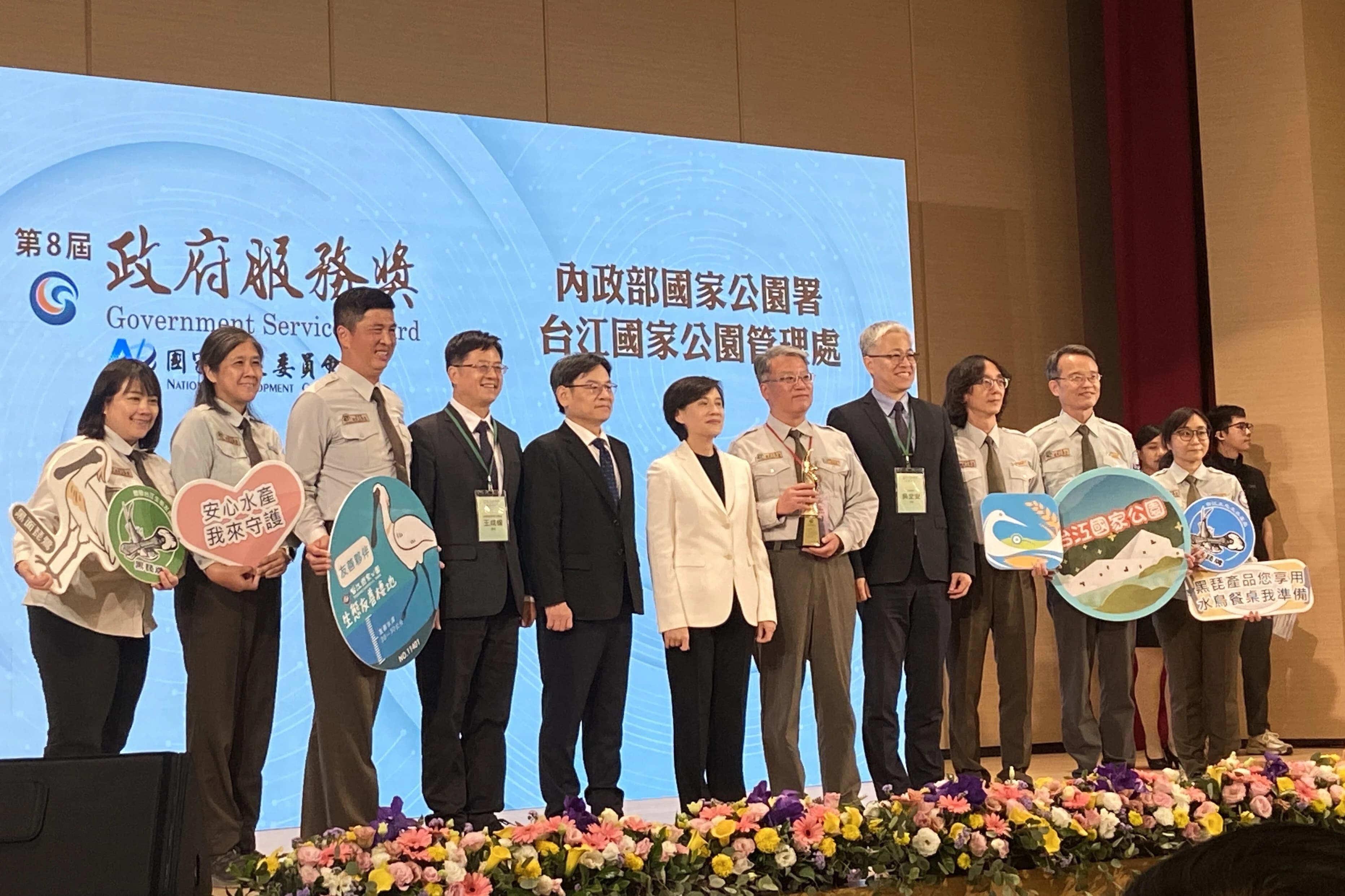內政部國家公園署台江國家公園管理處今(15)日獲頒國家發展委員會第8屆政府服務獎「社會創新共融獎」。內政部次長吳堂安表示,台江國家公園是候鳥遷移停留熱點,但因排除私有地形成區塊式園區,候鳥常跨界至周邊魚塭覓食,引發人鳥衝突。台江處深耕10餘年,以「黑琵甜甜圈」保育模式串聯遊客、漁民、社區及NGO,成功調解衝突、營造友善棲地,讓候鳥能安心跨越國家公園邊界,創造「不是國家公園的國家公園」新保育典範。