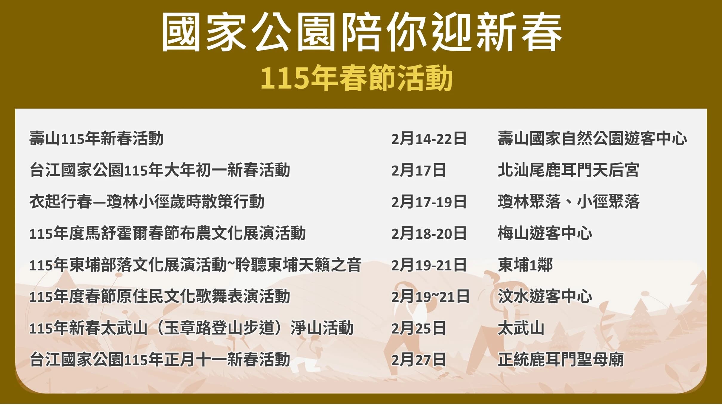 內政部指出,明(115)年第一季國家公園活動將以「元旦」及「春節」為重要節點,結合節慶文化與自然保育意涵,規劃具參與感之特色活動。元旦期間規劃七星山迎曙光、觀霧榛山健行趣等自然體驗活動,引導民眾以親近自然的方式開啟新年;春節期間則結合傳統年節文化,臺中都會公園一起寫春聯、壽山及台江紅包拓印、雪霸、玉山原民部落文化展演賀新春等活動,營造兼具年節氛圍與環境教育意義的公共空間,讓民眾在走春踏青的同時,深化對自然保育與永續理念的認識,展現國家公園在重要節慶中所扮演的公共服務與文化傳承角色。