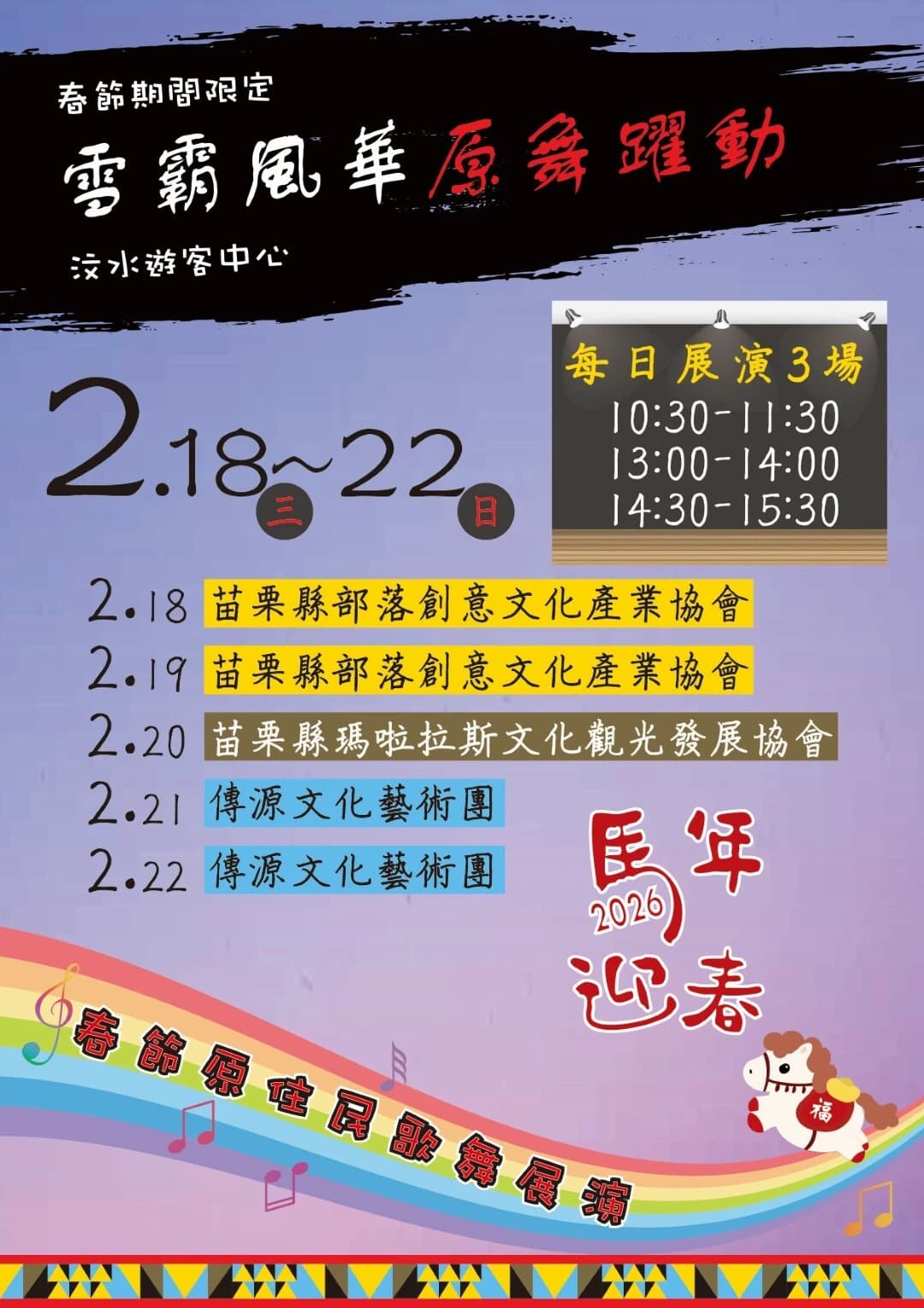 為迎接115年春節並營造熱鬧多元的年節氛圍,內政部國家公園署雪霸國家公園管理處(以下簡稱雪霸處)將於農曆春節期間2月18日(年初二)至2月22日(年初六)一連五天,在苗栗縣大湖鄉的汶水遊客中心第1視聽室舉辦「雪霸風華原舞躍動-115年春節期間原住民傳統歌舞展演活動」,每日3場展演(10:30、13:00、14:30),每場約1小時,邀請國人一起到雪霸國家公園走春歡度春節。