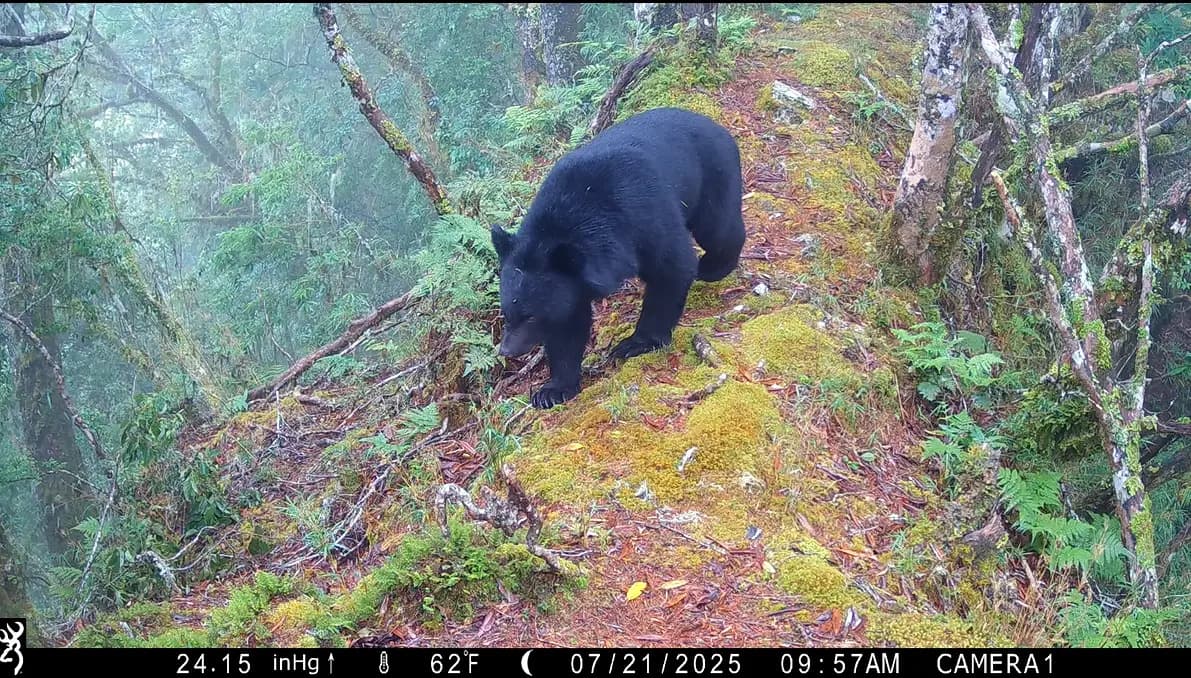夜深後的玉山國家公園並不寂靜。在冷杉林梢的風聲、玉山箭竹叢的沙沙聲、溪谷的迴音之間,紅外線自動相機正捕捉著一幕幕的山林日常,臺灣山羌輕巧走過林下、水鹿悠然停步覓食、獼猴群身手矯健地穿越林道。偶爾,畫面裡還會閃過一道黑色身影,胸前掛著醒目白色V字標記的臺灣黑熊,藉由科技儀器的觀測,這些畫面不再只是登山者口耳相傳的驚鴻一瞥。內政部國家公園署玉山國家公園管理處(以下稱玉管處)表示,玉管處自2025年3月起正式加入由國家公園署與林業及自然保育署共同推動的「全國野生動物長期監測系統」,以網格取樣(Grid-based sampling)的方式,選定園區內10處棲地維護與監測的關鍵位置,涵蓋不同海拔、棲地型態與遊憩壓力情境,架設監測相機,透過逐步建構玉山國家公園園區長期且穩定的野生動物監測系統,作為未來各項政策擬定、成效評估、遊憩服務與保育教育宣傳工作的基礎資料。