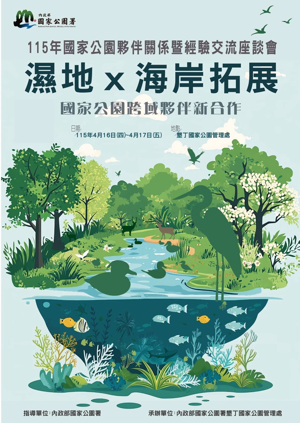 為因應氣候變遷與生態保育挑戰,內政部國家公園署今(16)明兩日於墾丁國家公園管理處舉辦「115年國家公園夥伴關係暨經驗交流座談會」,強化國家公園體系跨域合作與治理能力。國家公園署主任祕書孫維潔表示,自國家公園署成立後,已從原管理9座國家公園及1座國家自然公園「區域性保育」,進一步整合59處國家重要濕地「點狀保育」,以及整體海岸區域「帶狀保育」。本次座談會「濕地×海岸拓展:國家公園跨域夥伴新合作」為主題,回應當前國家公園治理的重要轉型,並引導國家公園夥伴們深入瞭解濕地保育及海岸管理實務,共同探討濕地與海岸永續治理的創新方向。