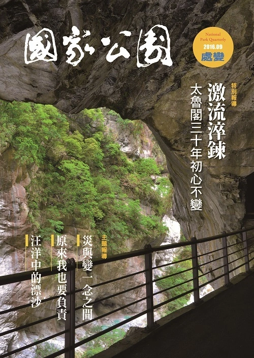 四季更送、花開花落的美好,颱風、地震的擾動等,都不是針對人類而發生的變動,但因身處其中,在擾動中卻難免有損,這些變動就成了災,人類如何調整才能與之和平共存呢? 特別報導一太魯閣國家公園成立30週年,擁有豐富自然與人文資源,歷經各種變動過程, 這段期間成長茁壯的過程與成果將透過現任處長、首任處長與許多同仁的訪談一一呈現。 主題報導一處變,專訪王鑫老師,以大尺度長時間的觀點來看看,到底什麼是「變」與「災」?人類又要如何應處才是適當之道。看著媒體報導的荒謬登山行徑,面對大自然裡的無時的變動,你真的準備好要登山了嗎?而隨著浪濤來去的海沙時刻變動著,大自然的力量在這也展現,如何了解其規律進而因應呢?台江、墾丁、東沙環礁國家公園正在努力中。「跟著博物學家去旅行」中森丑之助,走遍現今雪霸、玉山、太魯閣高山型國家公園的範圈,奠定臺灣考古的基艦,而近代考古學者劉益昌博士,則以長時間的現地研究與鍥而不捨的精神,解開了太魯閣國家公園中的黃金傳奇。「憶載印象」,太魯閣口的中式牌坊,是很多人記憶中對太魯閣的第一印象,它所扼的隘口位 置上刻印著多少歷史痕跡 ; 而金門國家公園裡 的得月樓則是另一則傳奇,富商與盜匪的鬥智 過往,透過留下的樓厝給予後人追尋的蛛絲馬跡。「他山之石」這次以日本三陸復興國立公園 為案例,討論面對自然變動與形成的災後,如 何重新 思考對海岸保護的機制。 「愛主張」則討論最近很夯的路跑,到底該不該在國家公園裡頭跑呢?「書情繪意」中擅畫能寫的作者以攀登玉山的實際經歷,在繪本中栩栩如生地道出沿途景致,讓人神往不已。「藝遊山河」的作家身兼金門國家公園解說員,見證國家公園在這片土地上努力與蛻變的足跡。