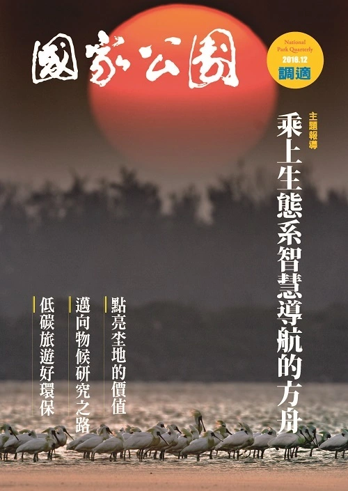 本期主題報導─調適,首先透過2016 年的世界保育大會,了解IUCN呼籲藉由跨國與跨域合作,積極推展以生態系為基礎的調適,來應對全球氣候變遷的挑戰,尋找增強人類社會適應韌性的方法;「坔」水土交接之處,濕地之所在,蘊育著各種生態與人文的可能性,今年在臺灣舉辦的國際濕地大會中,國家公園也為濕地保育與明智利用發聲;歷經堅實漫長的物候監測與研究,國家公園展現了階段性的成果,生態系調適的密碼需要恆心與毅力來解讀;除了理念跟研究,最重要的是具體行動,你我都能做的低碳旅遊,實際幫助了地球的環境。「跟著博物學家去旅行」透過才情並茂的川上瀧彌與為植物做戶口調查的黃增泉教授,看見臺灣植物之美。「憶載印象」的半屏懸綠雖今非昔比,終是透過各方努力保留了高雄的一抹綠意。「他山之石」介紹了美國國家公園針對氣候變遷所做出的實際政策與措施。「愛主張」談論野地宿營的禮貌與保護環境原則。「藝遊山河」終日穿梭在臺灣山林裡的楊南郡老師,雖於今年永別,但其典範仍一步一履引導著後進前行之路。「書情繪意」中七家灣溪櫻花鉤吻鮭的冒險,請細細品味這美麗生物為生存所作的努力。