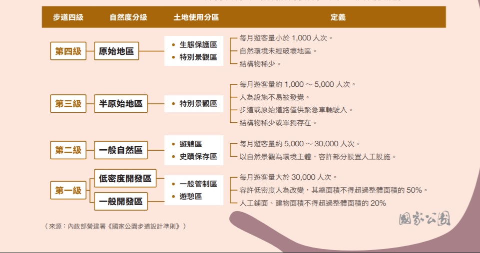 這份步道分級原則相當重要。依照開發度、人次流動數的狀況,分出一到四級,再依環境型態,分出五種類型步道,每種步道都擁有它們相應的功能、開發限制及適應需求。做出分類後,便可以讓主事者正確判斷各區無障礙計畫的輕重緩急:可以施作的地區,盡可能去完成;無法動工的地區,就不勉強,避免破壞生態。這種分級原則能夠讓無障礙實踐得更有效率,也能盡量在保育、育樂之間取得平衡。