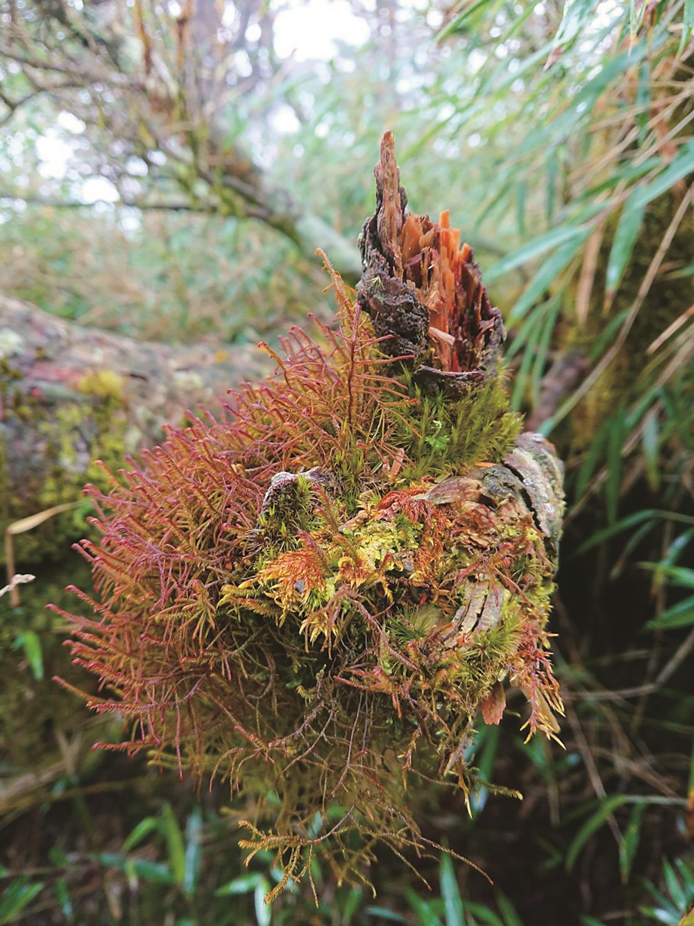 要說明這點,可從高木苔的分布說起。高木苔的分布區域很有意思,目前發現的地點,包含喜馬拉雅山脈、日本本州、臺灣玉山以及婆羅洲之巔—沙巴神山,皆在海拔3,000公尺以上,然而在太平洋另一邊阿拉斯加沿海發現的高木苔,卻是分布在100多公尺的低海拔地區。「更神奇的是,日本的高木苔研究者指出,無論生長在哪裡,高木苔DNA的分子序列竟然都沒有差異,顯示是同一來源。透過這些分布足跡,以及許多研究可以推論,高木苔曾被冰封在喜馬拉雅山脈中,當冰河溶解,冰存在冰河中的苔蘚也隨之大爆發,向外擴散。當時連在一起的古大陸皆是它的擴散點,能在玉山3,000公尺以上的區域發現這個冰河孑遺植物,讓人更加確認臺灣過去曾經歷過這段地殼、生態的演變史。