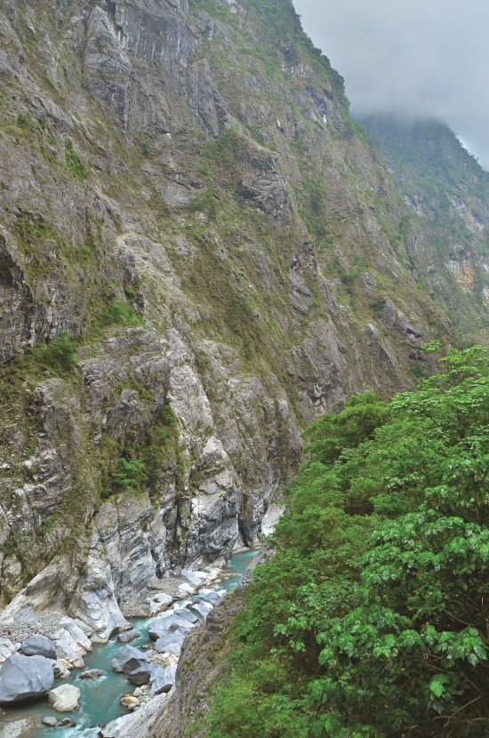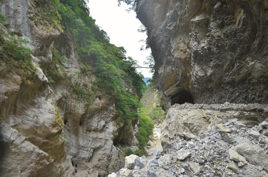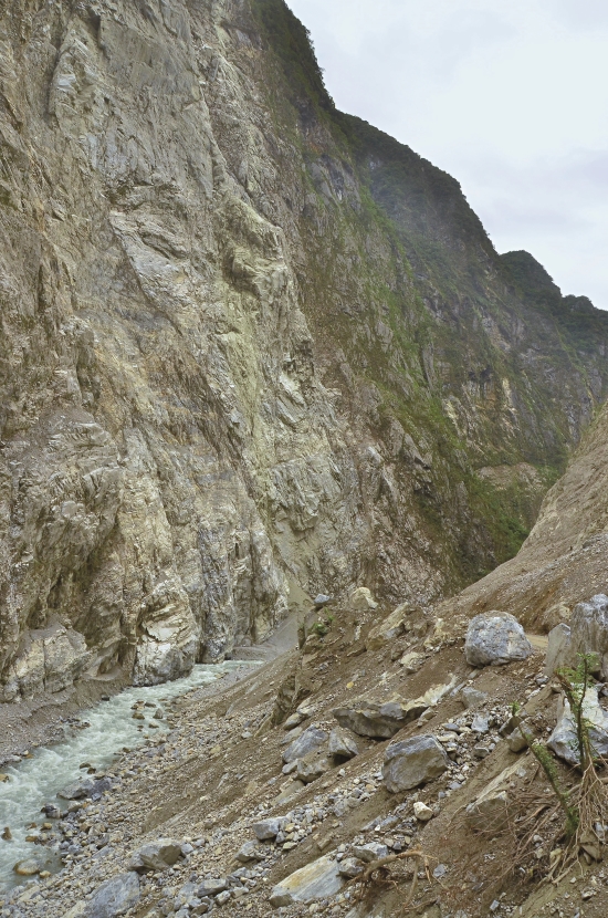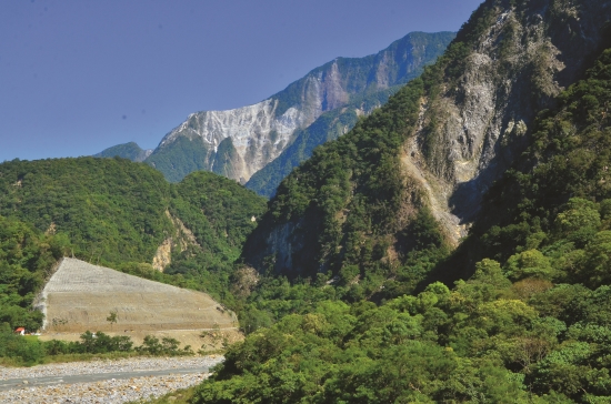 進入太魯閣口前,遠遠就可以看見 一道亮白的峭壁矗立著,乍看以 為山上積雪了!這是三角錐山的稜 脈,而峭壁下方便是太魯閣峽谷。 0403地震震落了遠處三角錐山崖壁 表層,露出大理岩的原色。而近處 的左、右兩邊也多了面積不小的坍 方。右邊的坍方,截斷了下方的小 錐麓步道;而左邊的,則使中橫公 路受阻。一來到太魯閣國家公園的 入口,就讓人深刻感受到地震帶來 的視覺震撼!