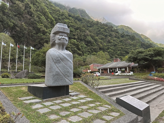 太魯閣遊客中心前的太魯閣族 Bayi石雕,面容慈藹地看著每 天來來往往的國內外訪客,也吸 引無數人與她合影留念。天搖地動的霎那間,她竟在平穩的基座上位移了一大半!差一點點就……,好險!