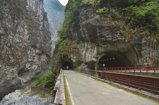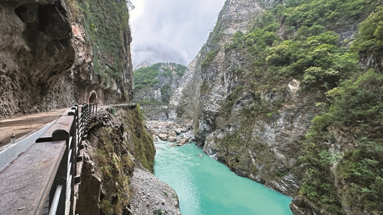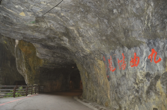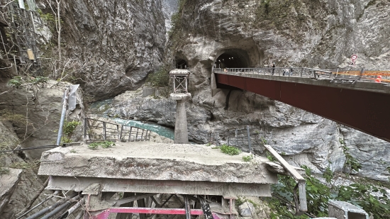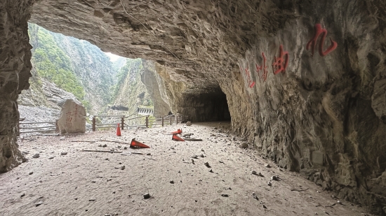峽谷的自然光從人工雕鑿的明隧道照 進步道,投射在「九曲蟠龍」4個大 字上,映襯著險峻的峽谷地景。這裡 是九曲洞步道的熱點,原本遊人如織 的步道,在地震後變得不一樣。從現 場積著厚厚的落塵及零散的落石、還 有毀損的護欄和傾倒的三角錐……, 可以想像地震當時的樣子嗎?