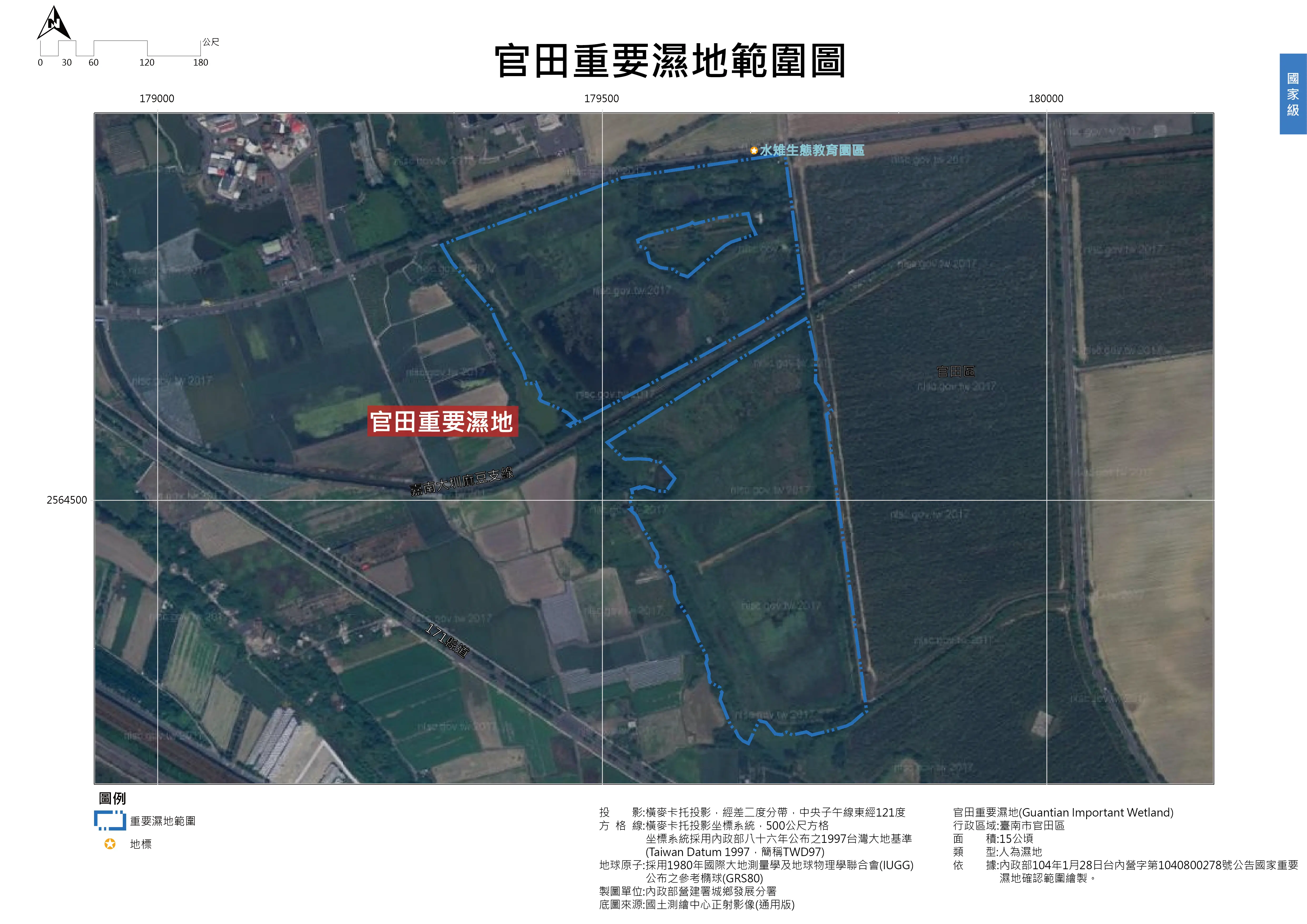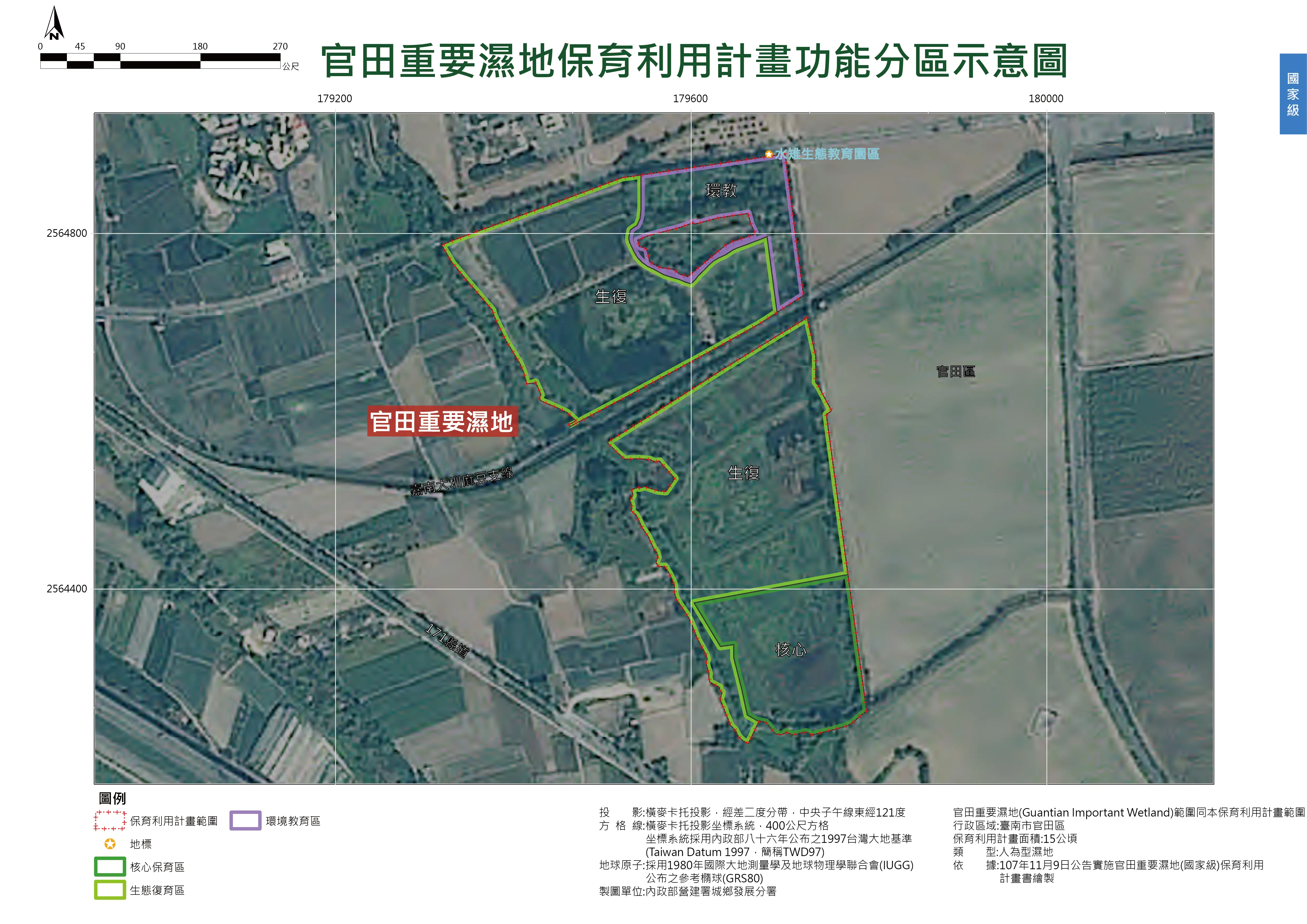 官田重要濕地位於嘉南平原的農業區,主要水源為嘉南大圳灌溉用水,由烏山頭水庫,經嘉南大圳灌溉渠道流進濕地。本濕地所在區域之供水方式依嘉南農田水利會年度灌溉計畫,分為雜作灌溉與水稻灌溉。